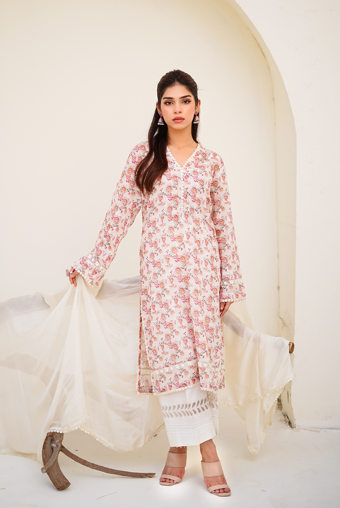 The Off White Silk Embroidered set from the Bahar - Eid Collection '25. Features an embroidered shirt with V neckline & full-length sleeves paired with matching Silk Dupatta.