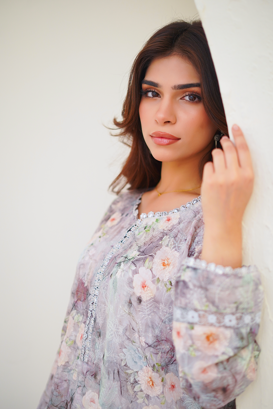 The Light Grey Silk Embroidered set from the Bahar - Eid Collection '25. Features an embroidered shirt with round neckline & full-length sleeves paired with matching Silk Dupatta.