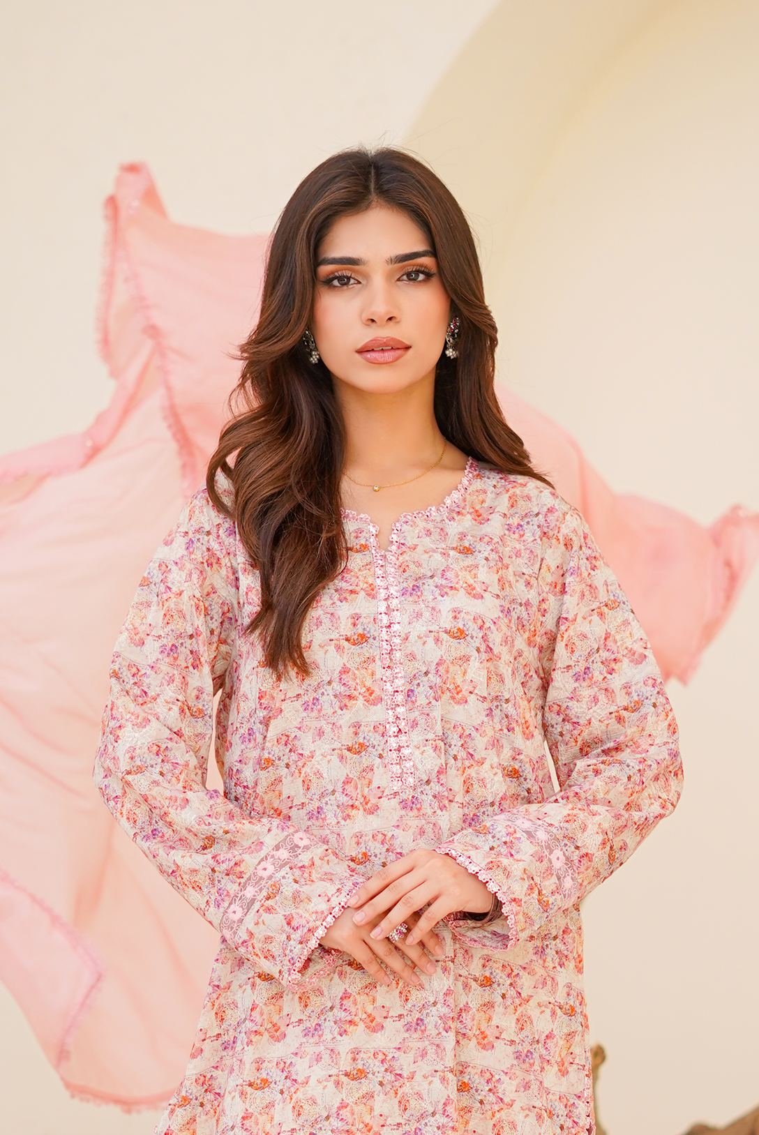 The Peach Silk Embroidered set from the Bahar - Eid Collection '25. Features an embroidered shirt with round neckline & full-length sleeves paired with matching Silk Dupatta.