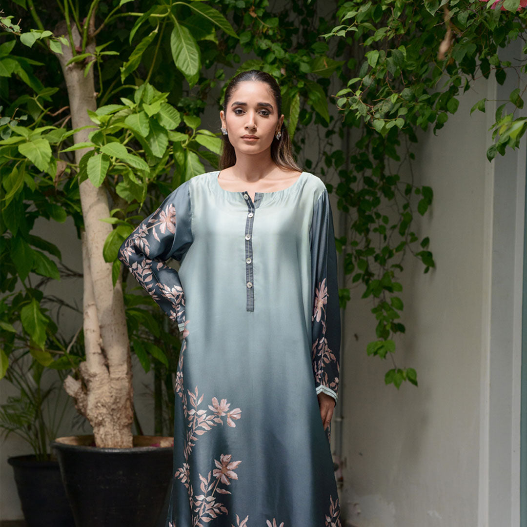 A 2 pc Kaftan with matching long top and straight plain trousers, crafted from premium silk in a serene green tone, Jade features delicate floral detailing on the sleeves and hemline. A kaftan, with its relaxed silhouette and subtle buttoned neckline, it’s the perfect blend of comfort and elegance for any occasion.