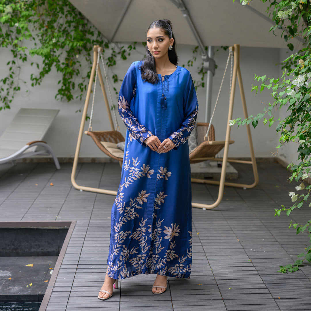 A 2 pc Kaftan with matching long top and straight plain trousers, in a bold sapphire blue, this silk design is elevated with graceful floral motifs along the sleeves and borders. The flowing cut Kaftan and tassel tie-neckline make Sapphire a timeless choice for refined evenings and festive gatherings.