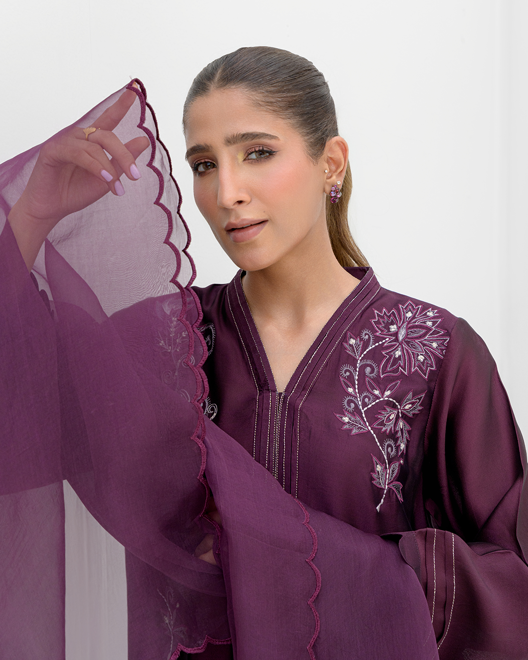 Wine Purple Sheesha Silk A-Line Outfit with Embroidered Organza Dupatta