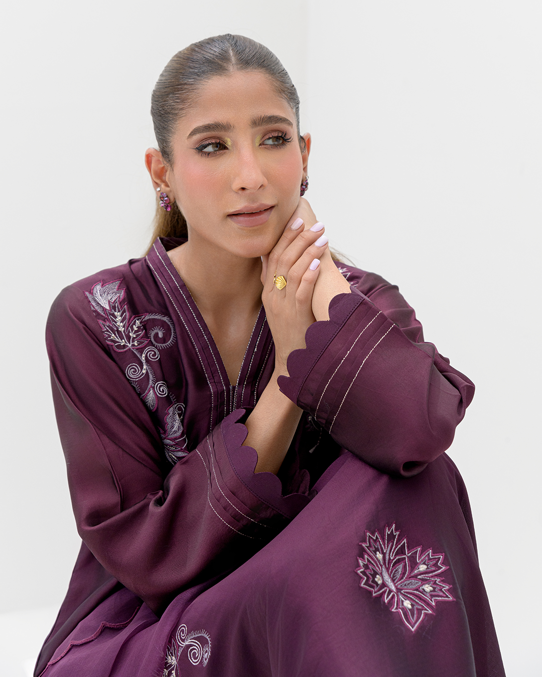 Channel effortless sophistication with this wine purple sheesha silk ensemble, designed in a flowy A-line silhouette that flatters every body type. The set features a beautifully tailored kurta paired with stylish culottes, creating a look that's both modern and timeless.